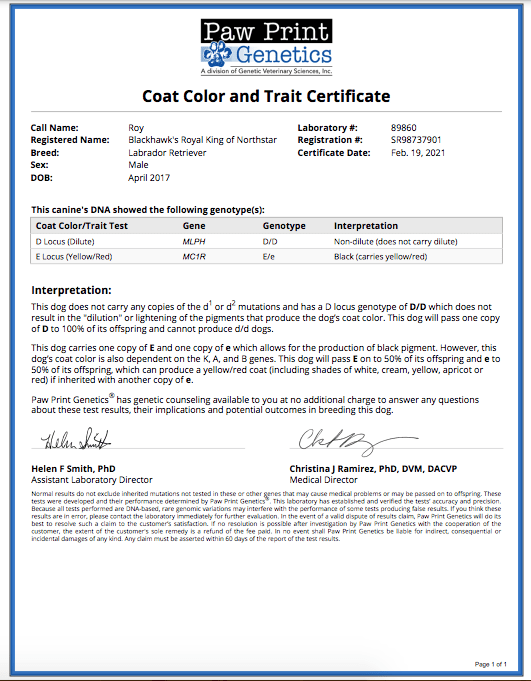 Health DOB: 4/19/1775 LBSEeBb (carries yellow and chocolate) – non-diluteOFA Hips ExcellentOFA Elbows NormalEye Cerf ClearDNA Tests Clear (EIC, CNM, PRA, RD/OSD) Share this: Share on X (Opens in new window) X Share on Facebook (Opens in new window) Facebook Like Loading...